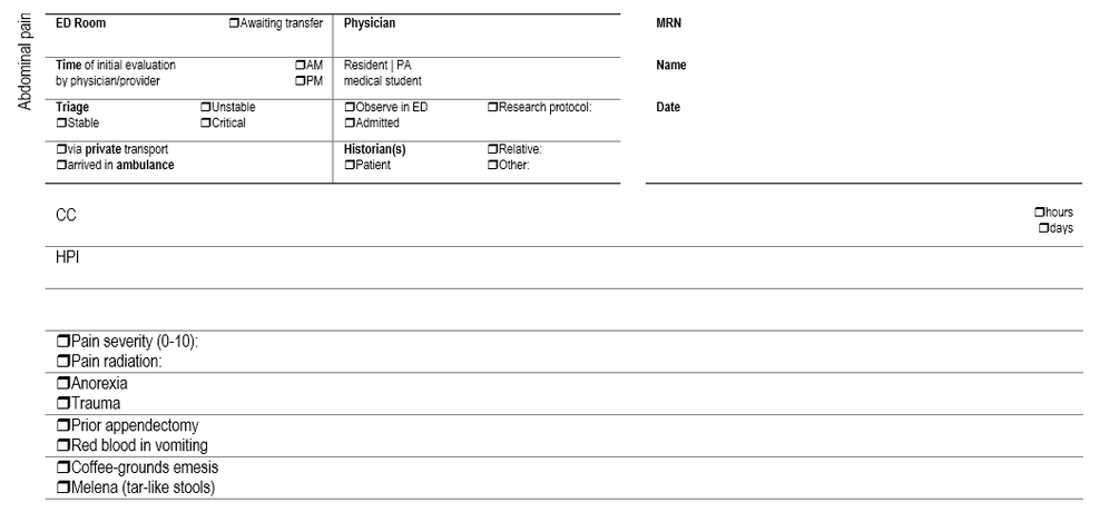 These templates help clinicians manage common emergencies such as chest pain, dyspnea, trauma, stroke, fever, abdominal pain and more. A modifiable blank template is also included.